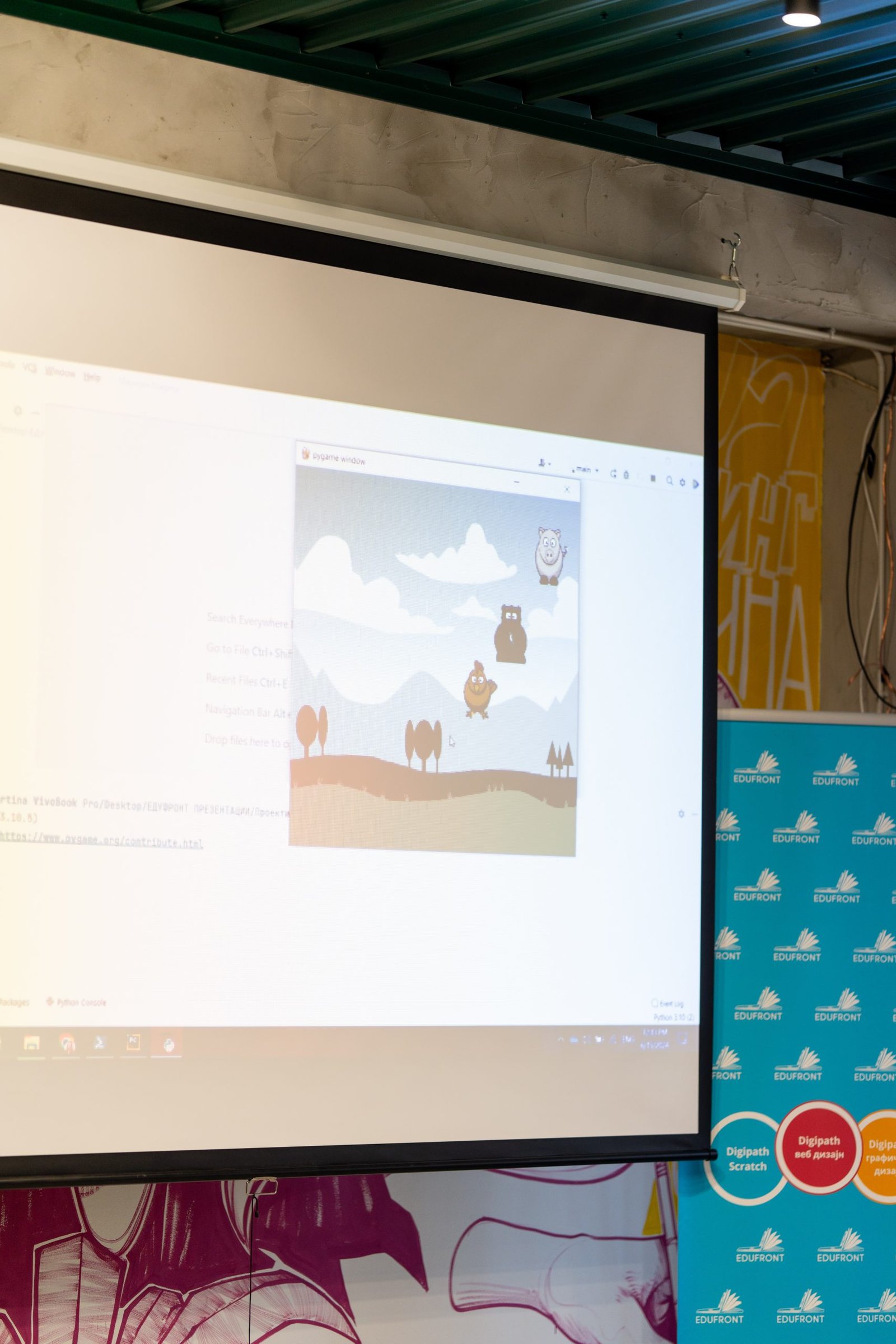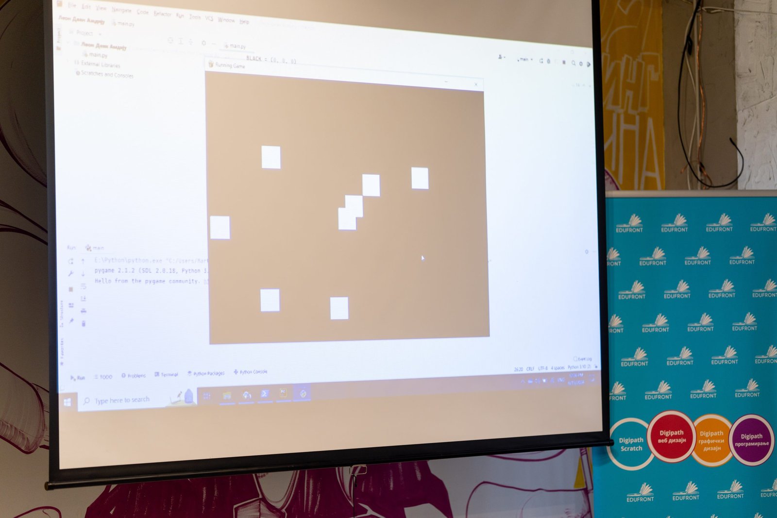 Програмирање во Python: Учениците кои ги завршија првите две обуки од оваа патека ни ги покажаа своите верзии на игри изработени во Pygame. Учениците од понапредните обуки за овој настан одлучија да ни презентираат примена на Python во Django преку мини веб проекти на теми од училишни предмети.